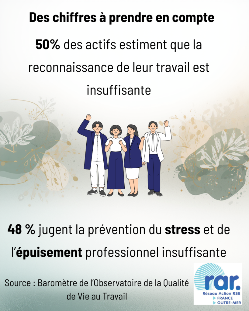 Ce constat démontre l’importance capitale portée à la reconnaissance du travail et à la prévention ou la gestion du stress et des burn-out. D’après ces chiffres, il s’agit là de trois attentions qui constituent le socle incontournable de la démarche RSE et des enjeux ESG qui lui sont liés.